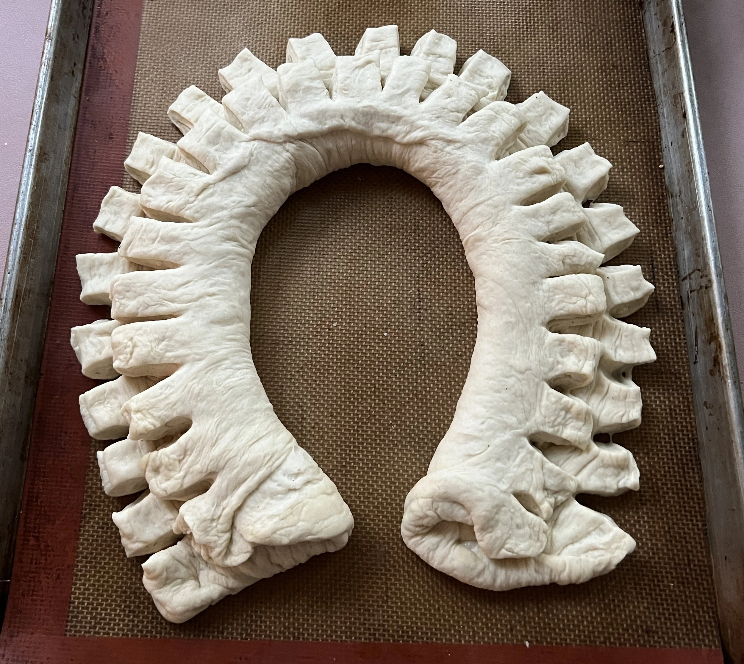 Then with scissors cut through each edge of dough (you can cut them at the same time or separately) about 3/4” apart and 1” deep. The fringe is on the outside.