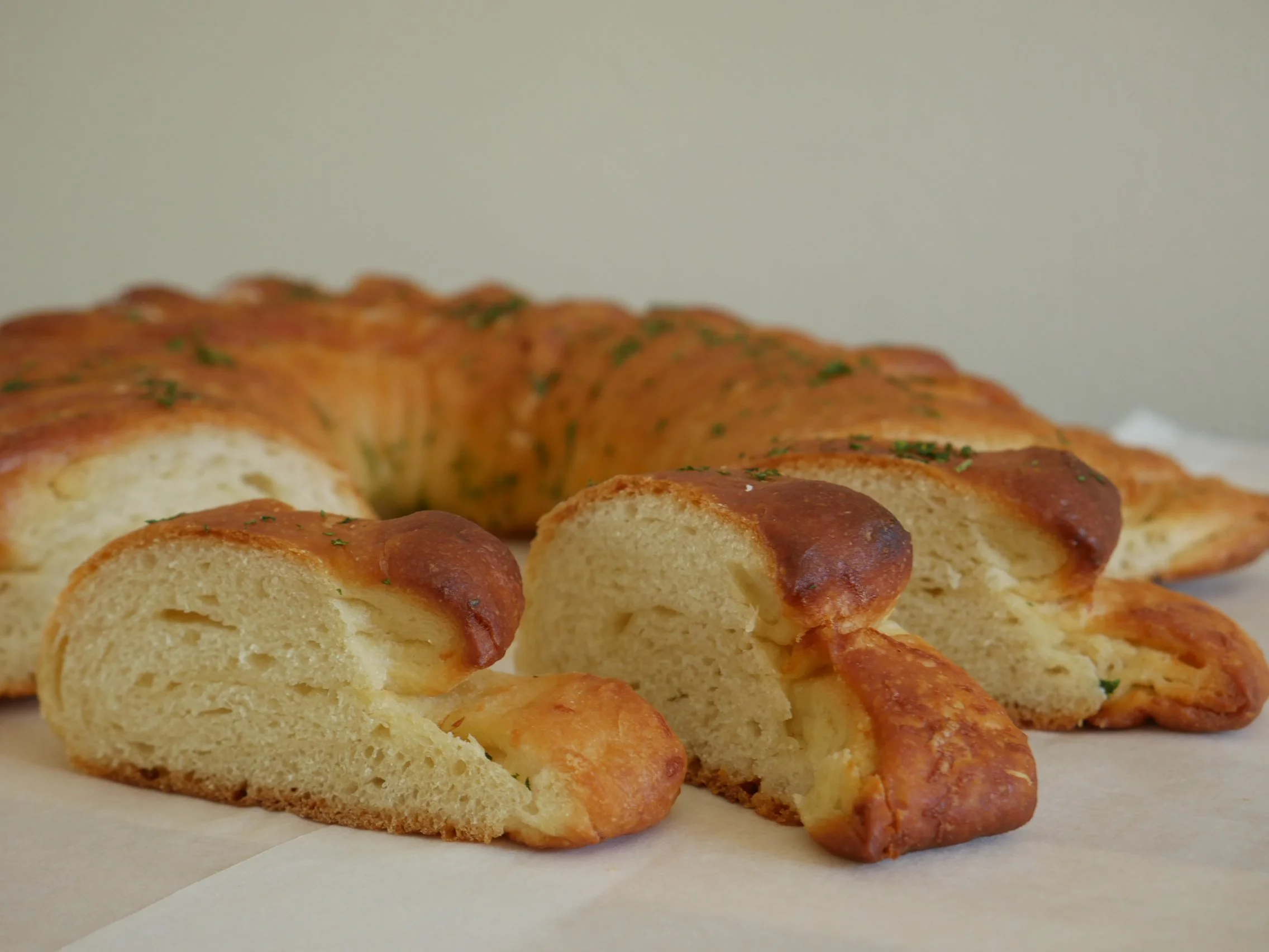 The fringed horseshoe shape looks cool - great for feeding a crowd. And the flavor - my inspiration was garlic knots - how could this not be a tasty success.